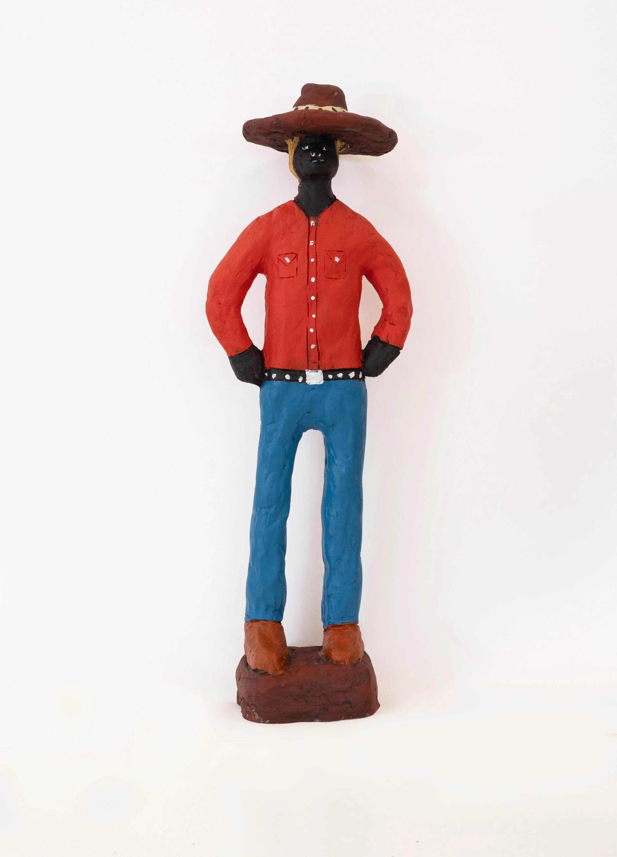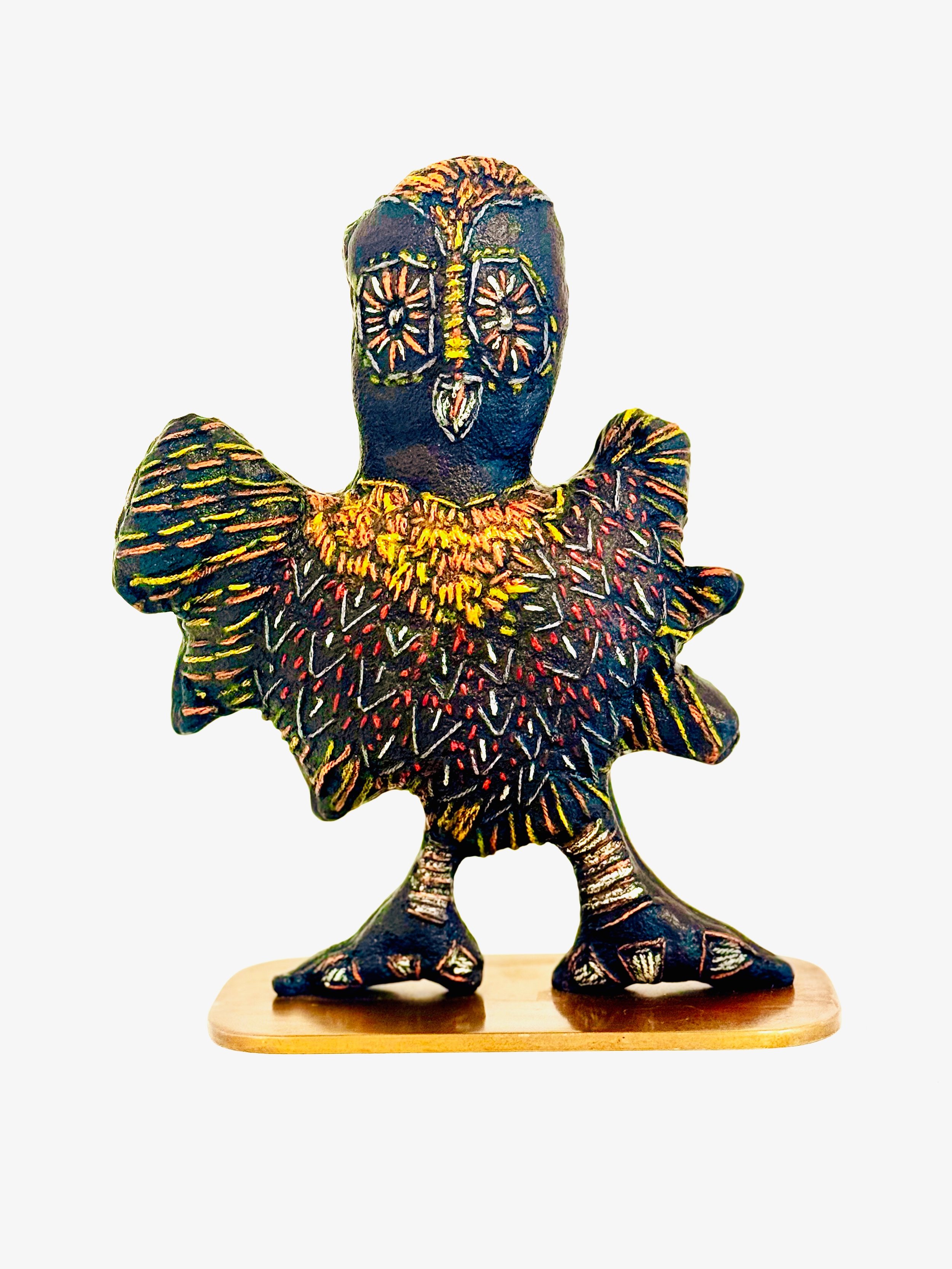 Yarrenyty Arltere Artist, Rhonda Sharpe, "Owl" in Bronze Sam Jampijnpa Mpetyan Dixon - Utopia Artist - “Bush Doctor” - Painted Acrylic Resin Dinny Kemarr Kunoth - Utopia Artist - “Cowboy” - Painted Acrylic Resin Dinny Kemarr Kunoth - Utopia Artist - “Footy Player” - Painted Air-Dried Clay
